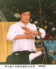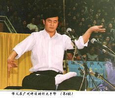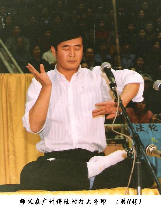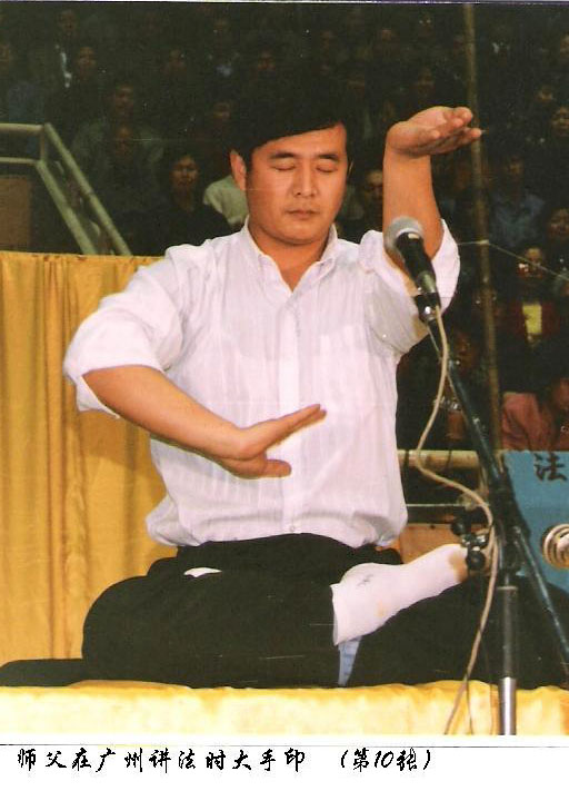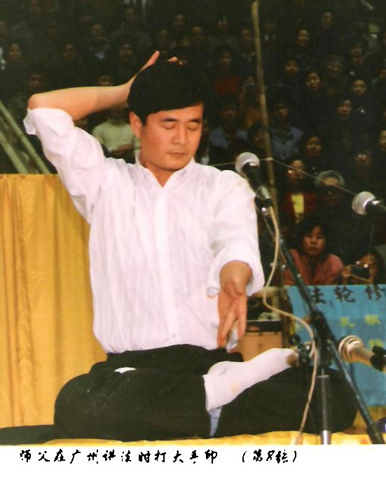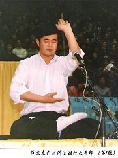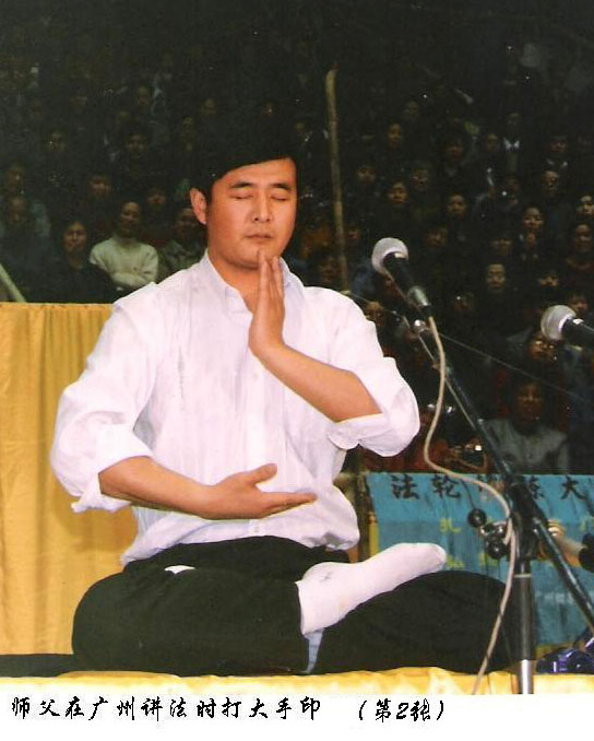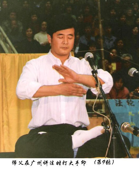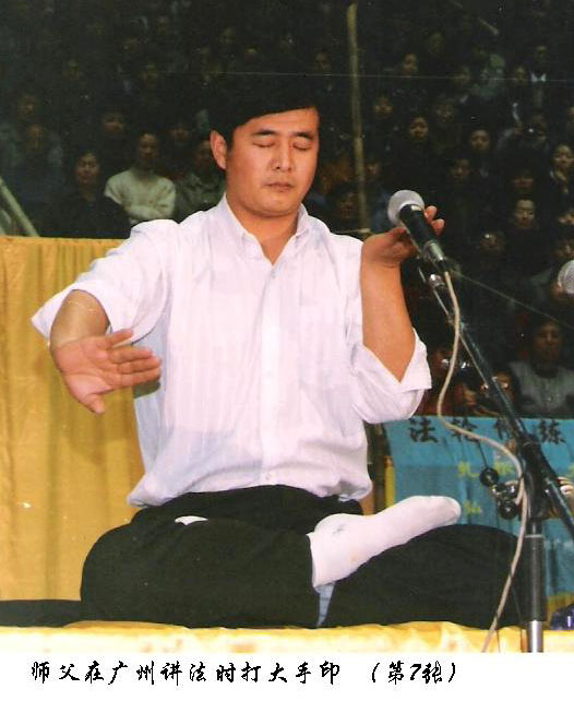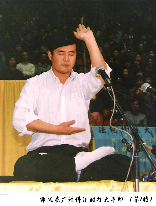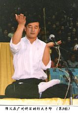 当时参加这次广州法轮功讲法班的学员有五千多人,是师父系统的教授法轮功的学习班中场面最宏大的一次,都是人传人、心传心,大家自觉自愿去的。我是在快开班前一天才决定去的。当时正上大学三年级,克服了很多阻力:请假不准,坐不上车,中途转车又买不上票等。到了之后,入场票已售完(以前参加过班的,票价一半——25元)。晚上开班前,没有入场的学员有近1000人,在场外集体炼功,等候师父的到来。师父一出现,大家非常激动。师父与主办单位协商把学员们排队带进来,但主办单位以盈利为目地不同意。师父在开始讲课前,来到入口处,看望在外面等候排队入场的学员们,足足有五分钟,面带微笑,慈悲祥和的看着大家。我们都激动的鼓起了掌。