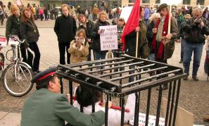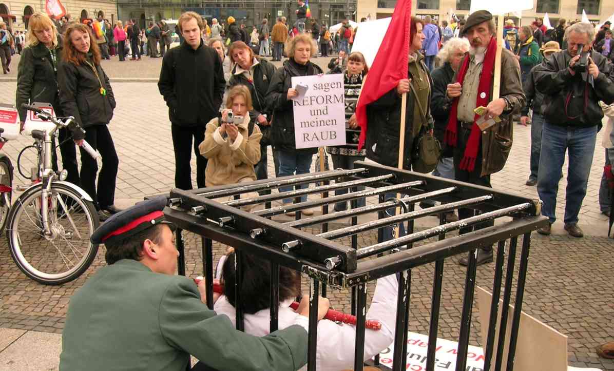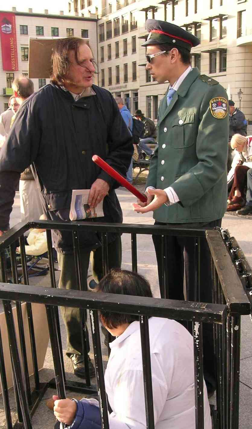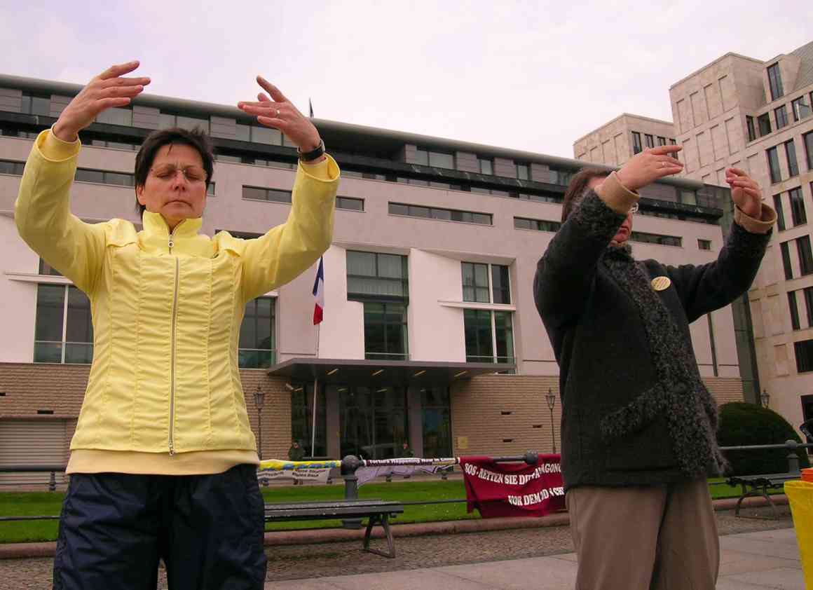 二零零五年十一月五日和六日,胡锦涛访问柏林前夕,来自德国各地的法轮功学员利用周末时间分别在柏林布兰登堡门(Brandenburger Tor)前的巴黎广场上和市中心的布莱柴特广场Breitscheidplatz 举行真人模拟法轮功学员受中共迫害酷刑展,并征集签名,签名将在近日交给德国政府,呼吁德国政府官员在与胡锦涛会面时,要求其立即停止对法轮功的迫害,惩办迫害法轮功学员的责任人员,并释放半年前从德国回到中国后,被关进劳教所的姜仁政,允许姜和他的家人回到德国。