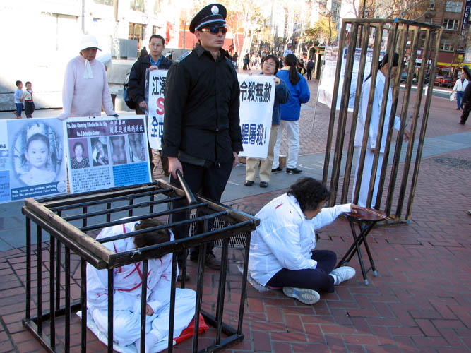 当天,法轮功学员还举办了真人演示酷刑,和图片展揭露更多中共对人权的迫害。