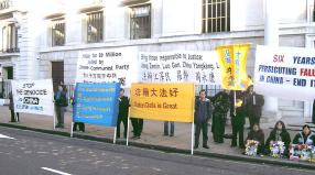 圣诞前的伦敦商业街上购物人潮密集,在游行队伍经过时,许多人们停下脚步,阅读横幅内容,接下或索要传单。队伍通过唐人街时,绝大多数华人都愿意接受传单,一些商家店铺的华人伙计都出来观看游行队伍。一位中国老人一面一面的看过了好几面横幅后,笑着说:“很好,很好。”