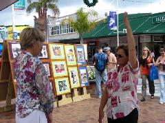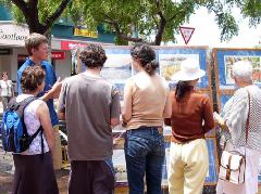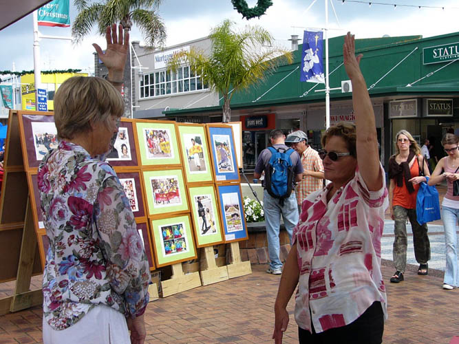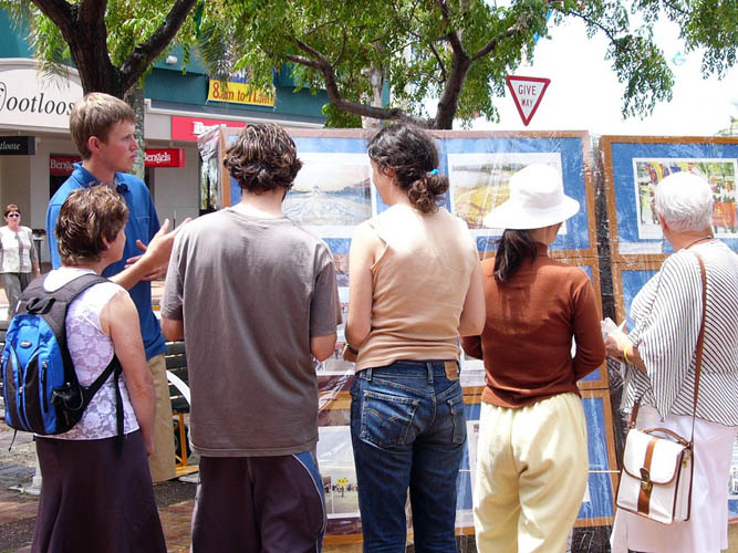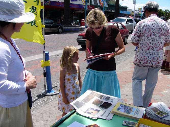 一位穿绿衣服的孩子了解真象后,拿了英文版的《法轮功》,表示要回去看。他旁边的华人孩子则表示,回家后要告诉家人,法轮功学员在中国受迫害的真象。