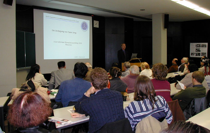 国际人权组织代表米勒(Müller)先生披露中共近年来对中国民众的迫害,在听众问到“中国存在那么多迫害人权的问题,我们应该怎么做”时,米勒先生认为德国某些政治家为了经济利益忽视了中国的人权问题,他们对中共采取纵容的态度。他特别举例,2002年江××到柏林时,他参加了抗议活动,当时他站在马路边上,中国的便衣警察要求在场人士掏出证件进行检查,当时他向站在一旁的德国警察提出异议,德国警察根本不管,还告诉他这是和中方达成的协议。米勒强调应该人人从自我做起,抵制中共对人权的迫害。