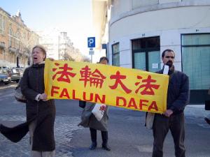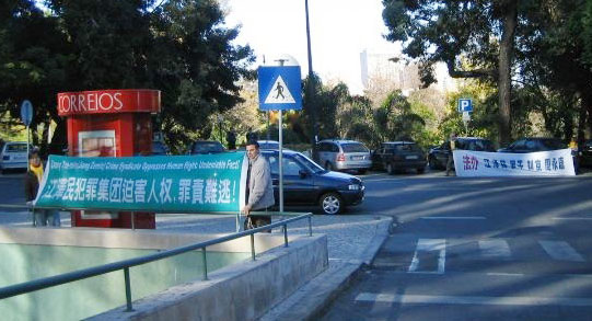 一位葡萄牙男士老人,看到马路对面打着中文的横幅,“法轮大法好”、“法办江泽民、罗干、刘京、周永康”等,急切的想知道横幅的内容,巧遇一群中国政府男女官员也正在看横幅内容,老人礼貌的用英语向这群官员问候,这些官员用英语热情的回应着老人。老人说,请问,你可以帮我一个忙吗?官员们连连说,请说。老人指向横幅,你们可以告诉我对面的横幅上写的是什么?官员们立刻显出为难的样子,低下头,不回答,慌忙离开了老人,老人怀着难以理解的心情正在思索,迎面走来一位法轮大法学员,笑着问老者,这是法轮功真象材料,您可以读吗?老者惊喜的接过材料,并述说了他想知道对面横幅内容的经过,学员立即满足了老者的要求,他连声说谢谢,满意的走了。