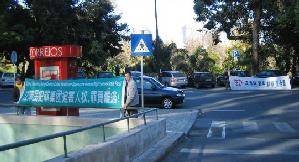 当打横幅的学员看见马路对面一群群的中国官员都在用心看横幅的内容,学员们热情的喊:“可贵的中国人,法轮大法好,中国同胞,你们好!法轮大法好!”看到大法学员那么友好,听到学员热情亲切的称呼,这些官员很为难,又不敢回应,低下头慌忙离去了。