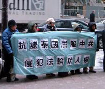 12月10日,法轮功学员为抗议中共恶警何雪健强奸女法轮功学员,在曼谷中使馆对面的马路边静坐,向来往路人讲真象、发资料,呼吁制止迫害法轮功。接近中午十二点时,一些警察和车辆在中共使馆进进出出,数十名警察、便衣穿过马路,强行搜法轮功学员的包,拖拉人,抢横幅等,已造成学员身体及财物损伤。当学员告知警察法轮功真象及揭露中使馆的恶行后,有警察表示他们并不想来,是中共使馆叫做的。