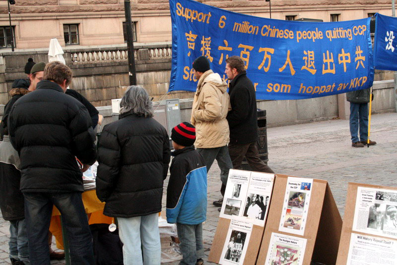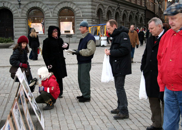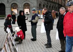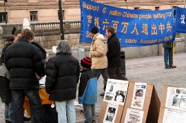 钱币广场离市政厅很近,与皇宫和国会只有一步之遥,这里还是人们观光购物的必经之地。中午12点,在钱币广场上,展开着写有“声援600万人退出中共”、“没有共产党才有新中国”、“维护人权,解体中共”的大横幅,摆放着揭露中共暴行的图片展。这些横幅与图片引起了瑞典市民与游人的震惊与关注,人们停下脚步认真观看并不停询问。尤其是中共现在仍在对法轮功修炼群体的令人发指的残酷迫害,令人们深感惊讶和不解。