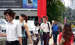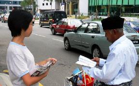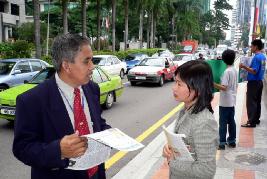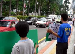 法轮功学员也在东盟高峰会议举办的地点外进行呼吁,当时正值午休时刻,外出用餐的民众纷纷向学员索取资料了解情况。路过的车辆纷纷慢行观看,也有的出席东盟高峰会议的外国代表向学员竖起拇指表示支持,一些参与高峰会议的代表也向学员询问了解在中国的迫害情况,还有一位印度尼西亚裔男子跟每一位在场的学员握手表示支持。