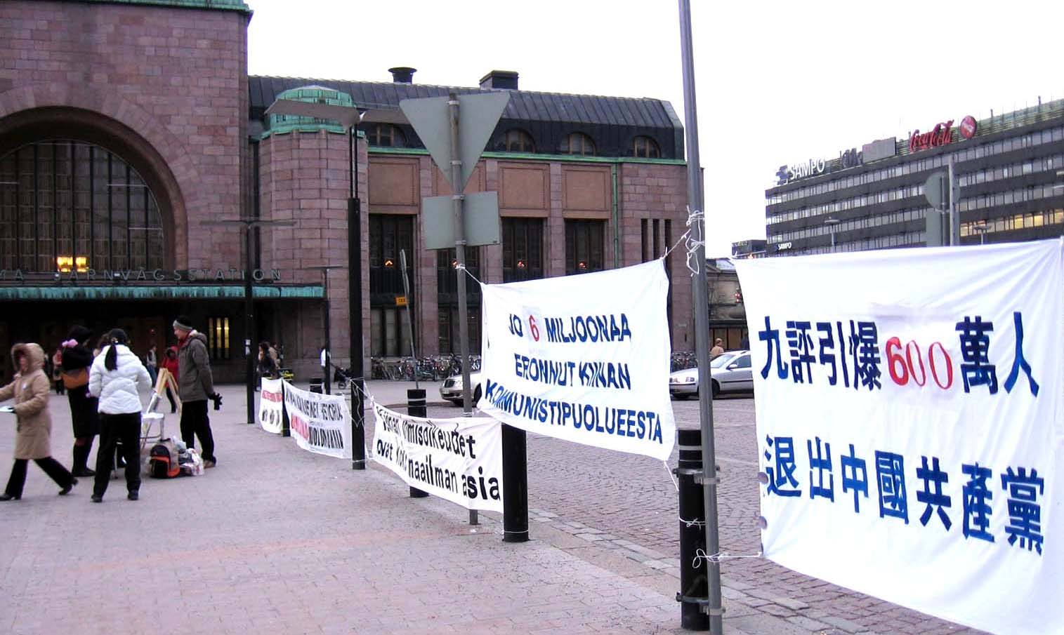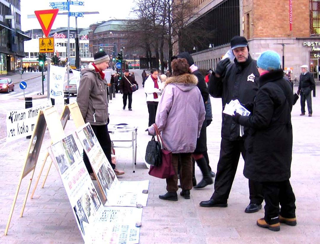 当天是赫尔辛基入冬以来最冷的一天,也是圣诞前夕人们忙于购物的日子,匆忙的人流络绎不绝。但在悬挂着“·九·评*引爆600万人退出中国共产党”的中、芬文横幅前,在中共历史上对中国人民所犯罪行的展板前,在法轮功学员高蓉蓉被电击毁容的照片前,人们放慢了脚步,表情中透露出同情和希望了解这一切的疑问。许多人立即接过资料或找义工询问。