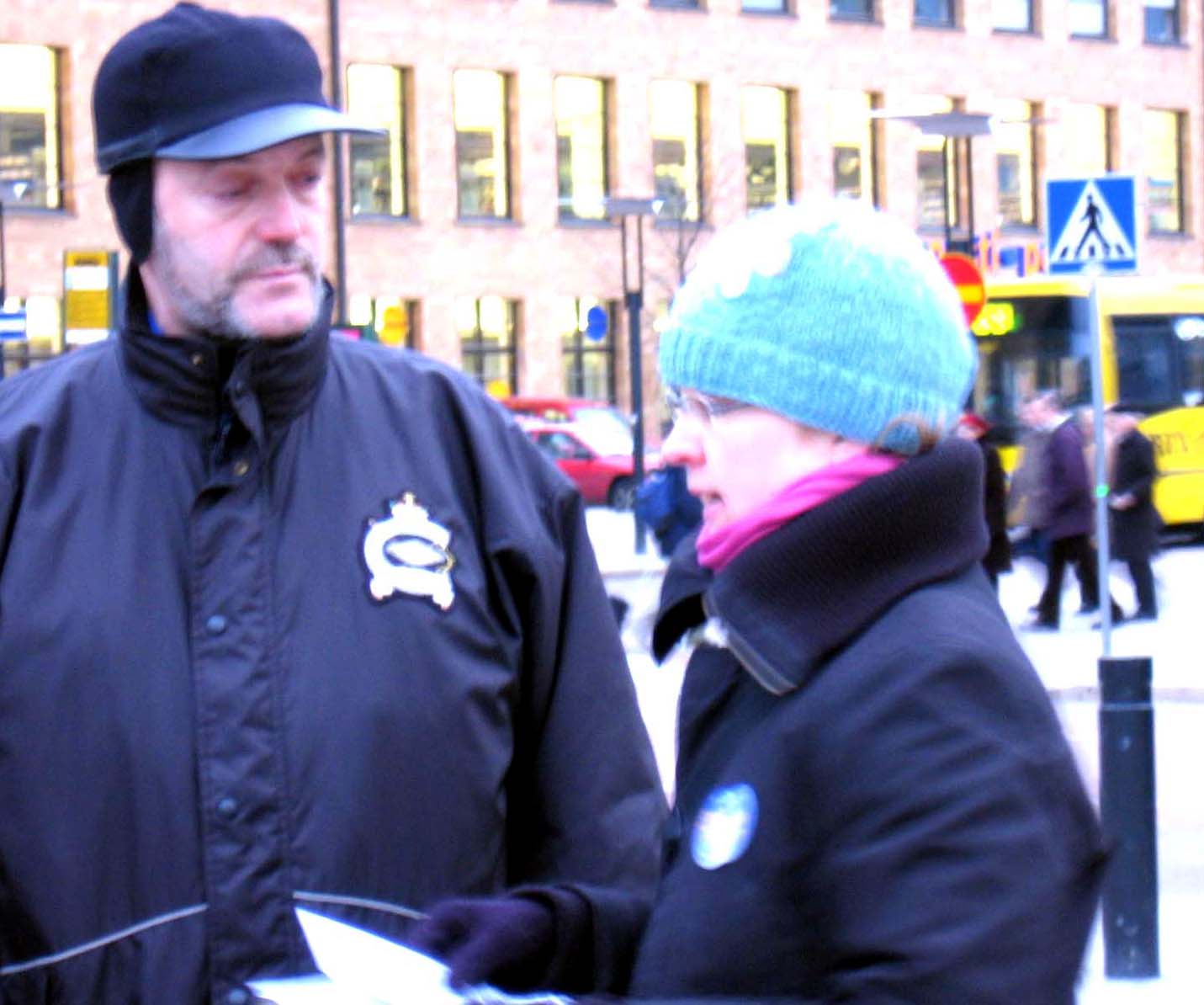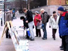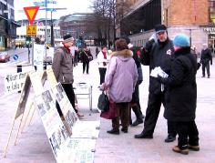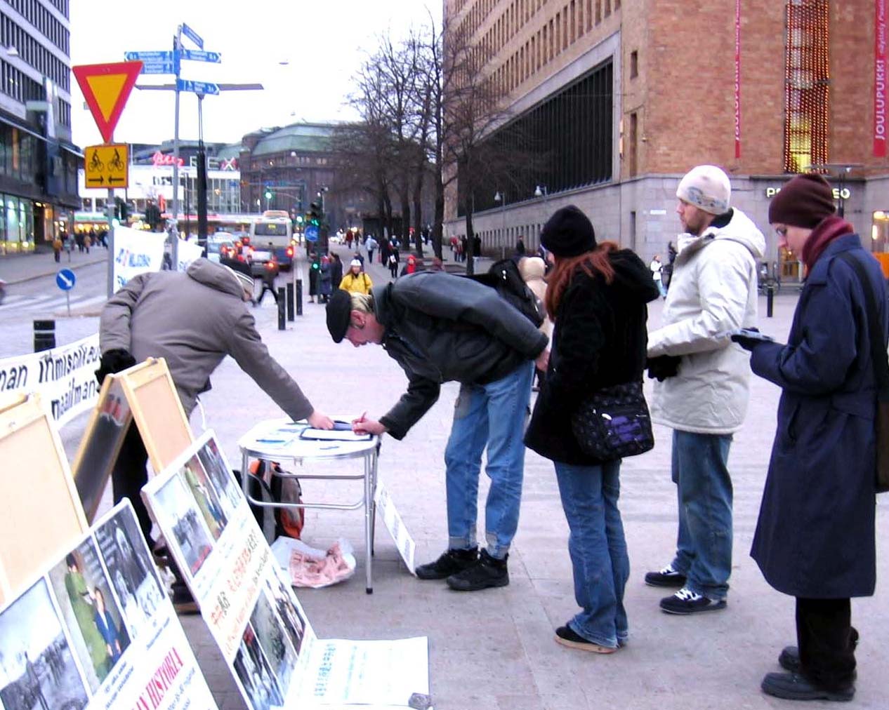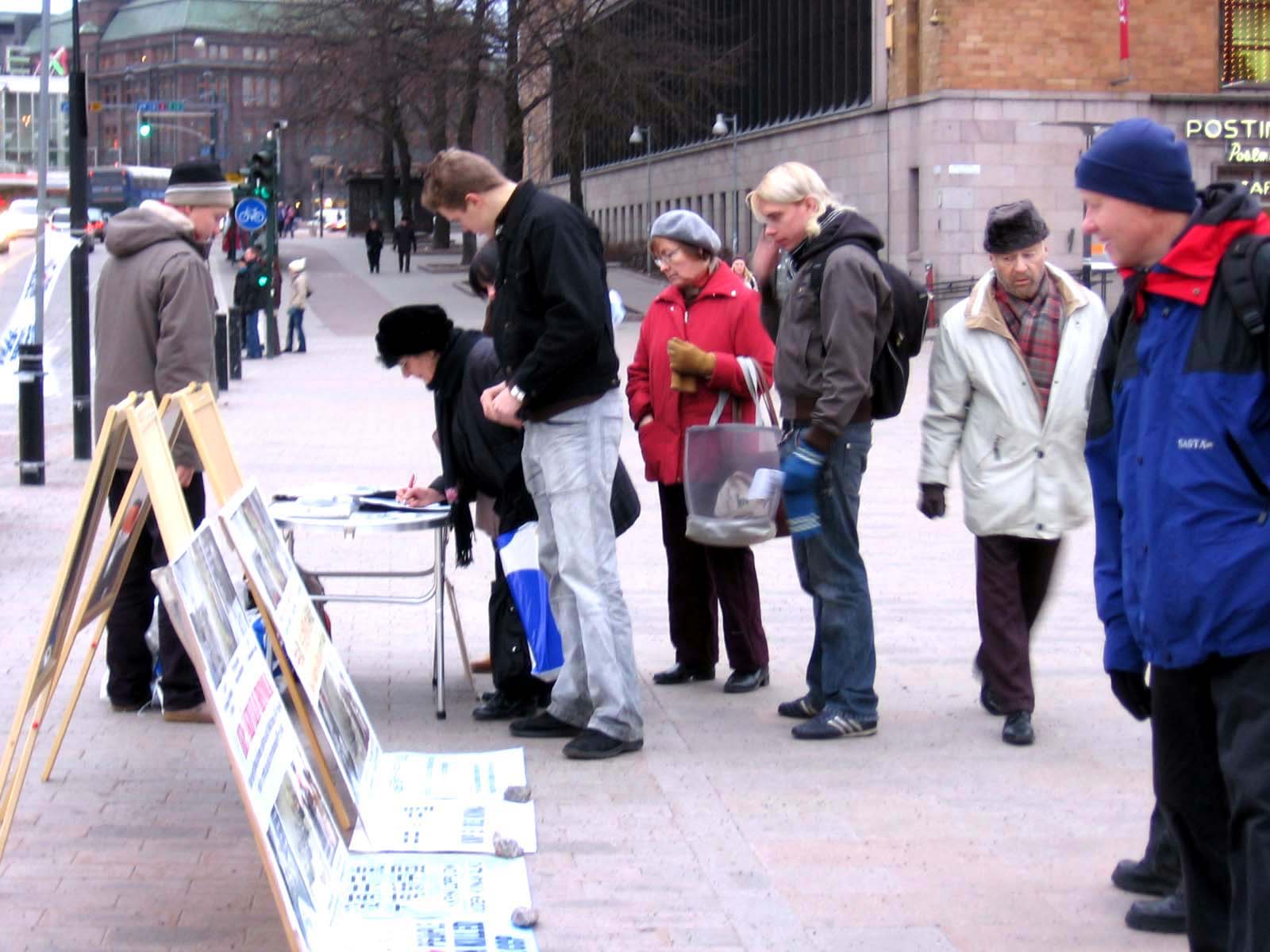 当天签名声援退!党!的人非常踊跃,签名簿刚摆到桌上,就有几位芬兰人迫不及待的前来签名。整个活动中多次出现排队等签名的现象。近来芬兰电视台陆续播出了中共屠杀汕尾村民、法轮功学员高蓉蓉被毁容并遭中共迫害致死、及对出走加拿大的前中共沈阳司法局局长韩广生揭露中共邪*党-内幕的报道,使芬兰人民对法轮功遭中共迫害的真象有了更深入了解,并引起对中国人权现状的高度关注。