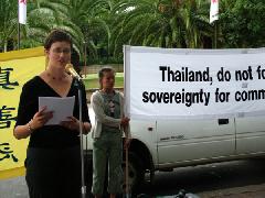 纽省法轮功发言人凯•茹布切克(Kay Rubacek)女士在新闻发布会上宣读了纽省法轮大法学会致泰国总领事的公开信。公开信中叙述了泰国警方在中共的压力下从12月9日开始对中使馆前和平抗议的法轮功学员不断粗暴干涉和骚扰,12月15日泰国警方在中共的指使下,甚至将在泰国中领馆前和平抗议对法轮功非人迫害的8名法轮功学员抓走,包括4岁、6岁、14岁的三名孩子。