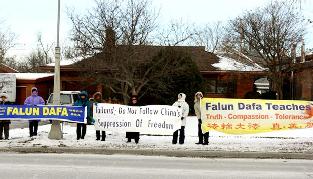 在法轮功学员抗议期间,对面马路上经过的小汽车都缓行下来,阅读法轮功学员的横幅。很多司机不断鸣笛,或伸出手竖起大拇指,以表示对法轮功学员正义之举的支持。