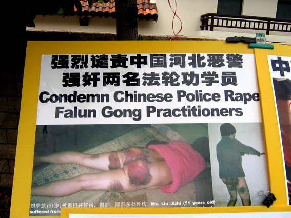 中共迫害法轮功六年多来,在其纵容、包庇下,对被非法关押的法轮功女性学员的性侵犯、性迫害已经多次发生。2000年10月辽宁省马三家教养院将十八名女法轮功学员扒光衣服投入男牢;2001年5月14日,北京警察殴打强奸一名女学员;2001年河北邢台警察轮奸多名女学员;2003年5月13日重庆警察当众强奸重庆大学女研究生、法轮功学员魏星艳;2004年,32岁的朱霞由于在洗脑班受到连续的强奸,变得精神失常。辽宁大连教养院恶警扒光女学员衣服,手脚都铐成大字形,然后往阴道里面塞辣椒,塞拖把,塞毛刷,导致受害者血流不止,疼的死去活来,并留下了严重的后遗症。