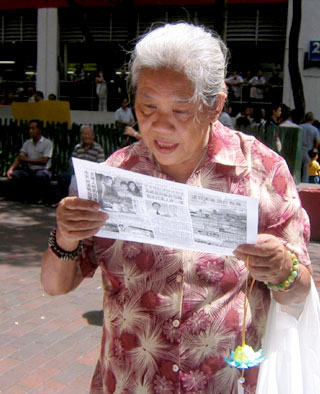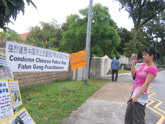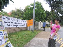 ![]() 认真阅读真象资料的老人 | ![]() 在中使馆前展抗议横幅及展板,路人拍照 |