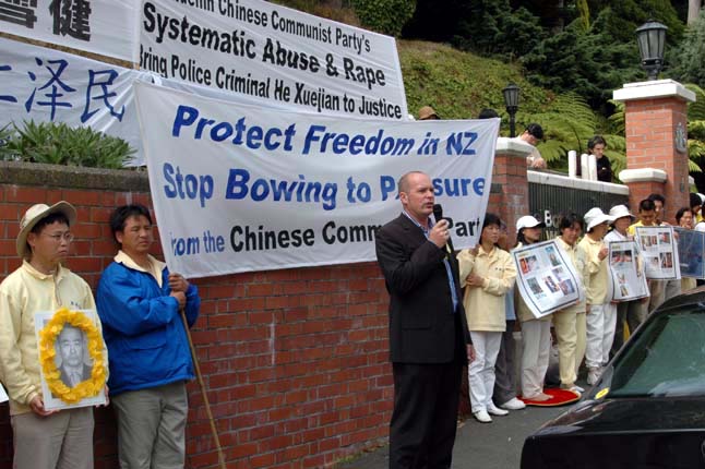 ![]() 新西兰法轮功学员中使馆外抗议 |