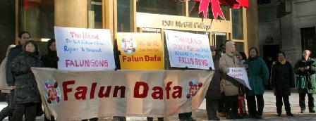 法轮功学员表示,之所以前来抗议,是因为泰国的法轮功学员由于反对中共的迫害而被捕。12月10日,在中共驻泰国大使馆前,法轮功学员抗议在中国河北省发生的警察公然强奸两名女学员的极端卑劣的行径,但是受到泰国警方抢夺横幅、拉扯、抓打等严重干扰。不仅如此,在12月14日,更有3名学员,按照法律的许可同往常一样正在散发真象材料时突然被捕,而15日又有更多学员因为和平抗议中共的邪恶迫害而被捕。期间有明白真象的泰国警察声称,他们并不想来,是中使馆叫这么做的。