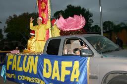 法轮功队伍前面是英文“法轮大法--真善忍”横幅,后面由腰鼓队、大唐鼓队、唐装舞蹈队、炼功花车、英文“法轮大法”横幅等组成。 “法轮大法好”歌曲融入居民的心中,腰鼓队、大唐鼓队的雄壮气势,唐装舞蹈队的精彩表演,优美的法轮功炼功动作,无不震撼居民的心,每到一处,“法轮大法--真善忍”使居民喜出望外,溢于言表。