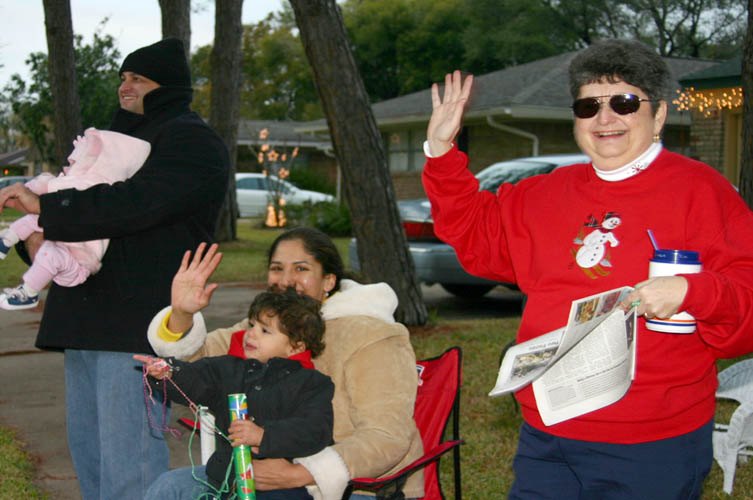 参加的队伍近二十个,法轮功队伍的参与为柏林河社区圣诞节游行增色不少,格外亮丽。游行队伍有邻里的大公司,如家用商店(Home Depot),飞牙达食物店(Fiesta Store),汽车行(Honda),也有学生乐队,还有用牛皮、牛头装饰的汽车,代表美国南部德州特有的风格,还有表演特技的汽车,社区的游行同样丰富多彩。柏林河(Burlinghall) 社区居民最难忘,最欢迎的是法轮功队伍。