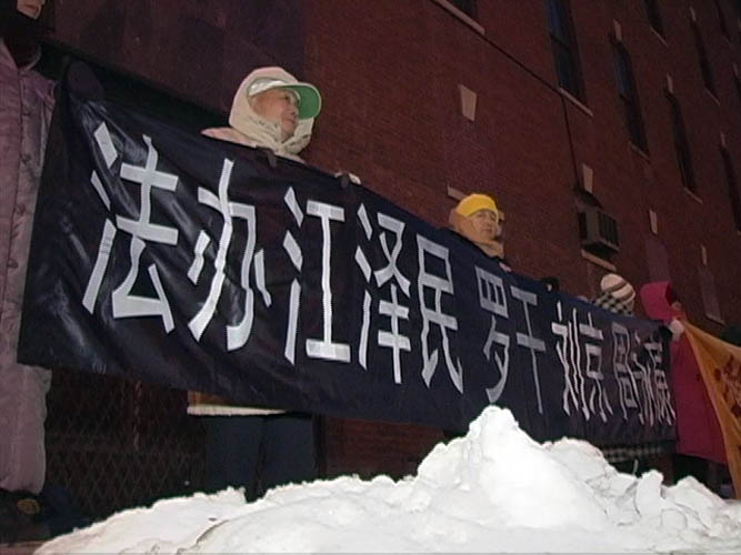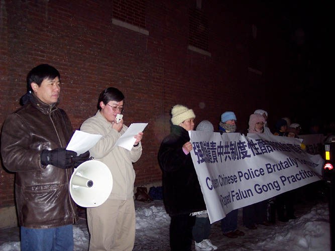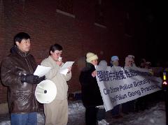 来自大芝加哥地区的法轮功学员们冒着严寒,于2005年12月17日在中领馆前举行抗议集会,强烈抗议中共恶党统治下对法轮功的残酷迫害,尤其是谴责河北恶警何雪健连续强奸两名女法轮功学员刘季芝和韩玉芝。中共江氏政治流氓集团对法轮功学员的系统性和制度性迫害触目惊心,其中对女学员進行有组织的性虐待更是令人发指,警察执法犯法,流氓强奸等禽兽行为屡次发生。