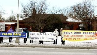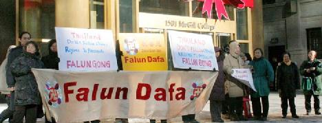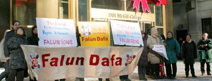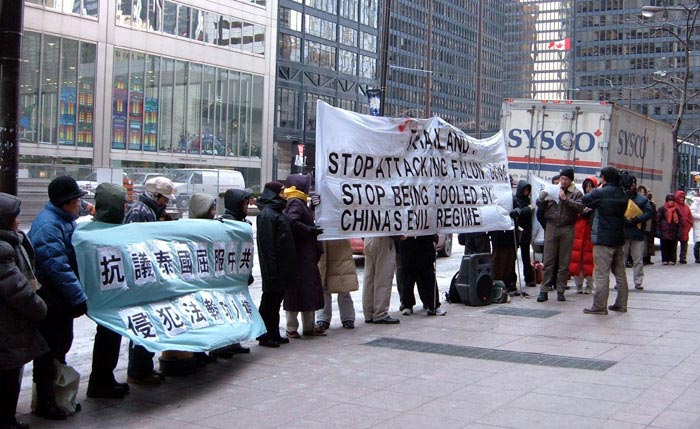 2005年12月14日中午,数十名法轮功学员聚集在泰国驻加拿大多伦多领事馆前,抗议泰国警察在12月10日国际人权日那天,对在中共驻泰国大使馆对面和平抗议的法轮功学员施暴。