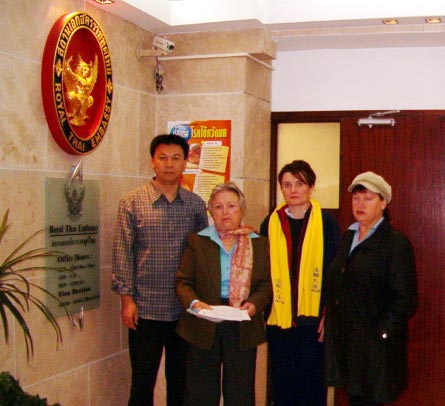 2005年12月16日上午,5名法轮功学员来到泰国驻以色列使馆,就发生在曼谷泰国警察在中共使馆的指使、教唆下逮捕了8名在中使馆对面抗议的法轮功学员一事(其中包括3名未成年的孩子,他们的年龄分别是4岁、6岁和14岁),同泰国大使助理进行了交谈。法轮功学员向助理介绍了法轮功以及发生在中国的迫害,并表达了对泰国警察受中共使馆唆使侵犯法轮功学员人权一事的关注。泰国大使助理表示,他一定将相关资料和所反映的情况寄往曼谷,并表示他将同法轮功学员们保持联系。