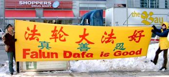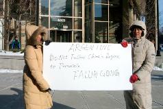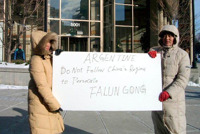 今天阿根廷领事馆前寒风呼啸,气温给人的感觉是零下20度,街上很少人。法轮功学员坚持在人行道上举横幅、发法轮功真相资料,持续了约一个半小时。