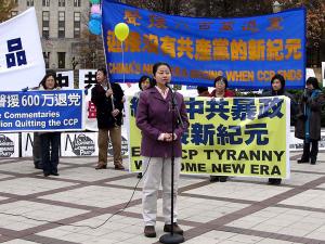 “作为来自大陆的法轮功学员,2000年6月,那时我们被中共的迫害逼得没法,一上访就是警察守在门口,问到名姓把你再捉回去,所以我就到了中南海打横幅。被他们(警察)带到了一个地方,问是什么派出所,还不敢告诉我,后来我才调查到是府右街派出所,就是1999年4-25和平请愿的府右街一带。那天当天下午把我们抓進去,外面就是暴雨倾盆,我在里面被他们车轮战,就是被这个中共伪政权来所谓的‘审问’,对做好人的人他们要‘审问’。我不报自己的姓名地址,在里面也不知到几点,我就记得很清楚,那个个子不高的,看起来受过教育的、瘦弱的、看着模样30多岁的一个警察就突然威胁我,‘啊,你不说,那到了晚上12点以后,看我怎么着你!’我想身为女性,听到这话那威胁的意思再明显不过了。之后他又连续威胁了几遍,最后我流泪了,觉得真是……,他们就等于是这个邪恶中共的工具呀。”