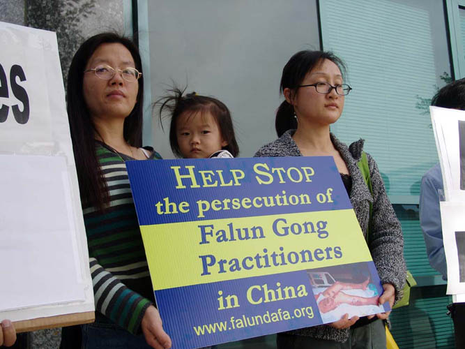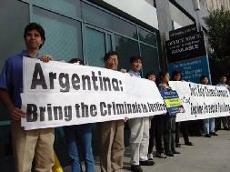 ![]() 法轮功学员在阿根廷领事馆门前打出的标语 |