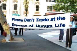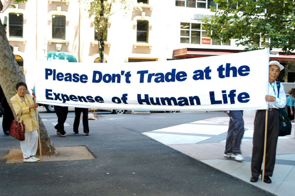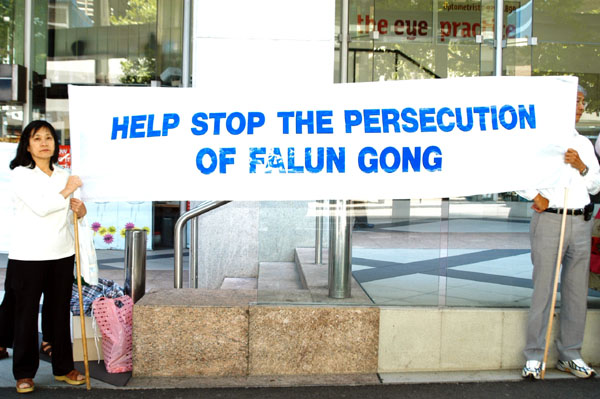 中午12点正是悉尼市中心最繁忙的时刻,过路的行人车辆不断,部份法轮功学员拉开了横幅,还有一些学员发真相资料。