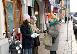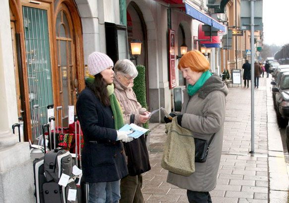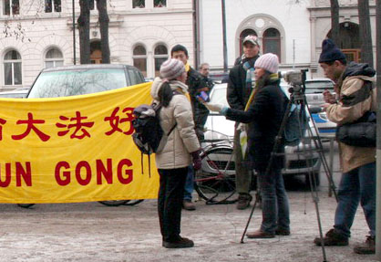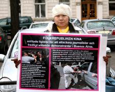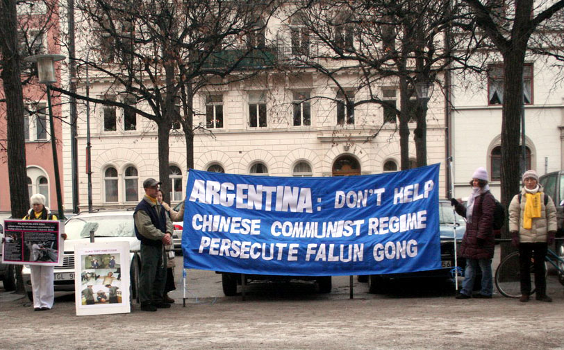 2005年12月22日中午,瑞典法轮功学员在阿根廷大使馆前抗议,善告其政府部门不要帮助邪恶中共迫害法轮功。