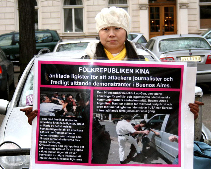 2005年12月14日,法轮功学员在阿根廷国会前向罗干率领的中共代表团抗议时,遭到中共使馆派出的暴徒的殴打,横幅和真相展板被抢走。在场的警察迫于高层的命令对此视若无睹,并没有阻止暴徒的行径。事件发生后,世界各国法轮功学员纷纷谴责中共把迫害延伸海外的罪恶行径,同时来到当地阿根廷使、领馆,呼吁阿政府不要屈服于行将灭亡的中共的淫威,应坚持正义的立场,维护人权。