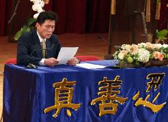 会场外的大厅挂起几条巨型条幅,条幅上写:“法正人间”、“法正乾坤”、“法轮大法好”等,气势令人震撼。法会现场庄严温馨,师父的法像高挂中央,高悬于大厅两侧的是长达数米的巨型横幅:“慈悲能溶天地春 正念可救世中人”(《洪吟(二)》),这金光闪闪的大字使整个会场熠熠生辉。主席台上精心布置的鲜花饱满美丽、清香四溢,讲台上一排晶莹剔透的莲灯,代表千千万万大法弟子象金子般坚定的心。