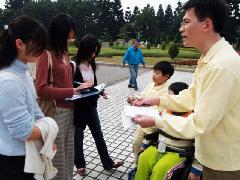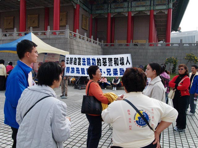 香港学员带着未学炼法轮功的儿子与女儿一同参加2005年台湾法轮大法心得交流会,儿子感动于数千名法轮功学员参加排组法轮图形,主动提出要帮忙举横幅;而行走不便的女儿,也自己推着轮椅到中正纪念堂各个入口处征集签名,许多民众主动停下来问可不可以签名。母亲表示,虽然女儿未修炼,但对讲法轮功真相一点都没有怕心,也很爱派发资料。