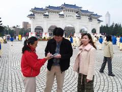 ![]() 中国人拍下梁晓丰呼吁的画面,带回给家乡亲朋好友看 | ![]() 认真听着法轮功学员讲真相的台湾民众 |