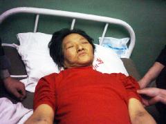 我们问她:“你怎么样?吃不下饭多长时间了。”“有四个多月了,盐水就给灌坏了。”“身上的伤是怎么弄得?”“热水袋烫的,感到浑身冷的很,抱着热水袋就放不开,身上被烫起泡都没有知觉。”“谁迫害的你,知道吗?”“知道。”然后就不说话了。手紧紧握住同修的手,小声的自言自语的说“不容易啊!不容易。”