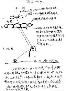 一次,丁振芳老人为了表达心声,在自己的衣服上写下了“真、善、忍”和“法轮大法好”,被看到后,一个姓王的所长抬起手对着老人的脸就是一巴掌,打的很响。接着,把老人拖到斜对面的楼梯内,狠狠的抽打,然后拽着老人衣领到办公室,王让劳动号犯人用剪子剪老人的衣服,老人大声警告她们,她们没敢动剪子,但他们几人强行把老人衣服扒下来,把老人押到待发间打了地环(刑具的一种)。(见下图)