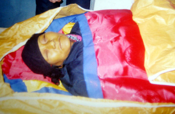 【明慧网2005年12月30日】被甘肃省兰州女子监狱致死的同修赵凤莲的追悼会于2005年12月25日(星期天)早晨8点整在甘肃金昌市金川公司职工医院吊唁厅举行。参加追悼会的人很多,家属、亲戚、朋友十分悲伤,她的家人由于害怕被牵连,只字不敢提赵凤莲被兰州女子监狱迫害致死的情况,追悼会始终在沉闷、悲愤的气氛中进行,但是同修送的花圈上两幅挽联引起了人们的注意,一幅是:“万古缘,一线牵,坦荡胸怀,谁知我愿;朝闻道,夕可死,得遇大法,光耀万千。”另一幅写着:“大法徒,擦干泪,正念扫寰宇;修大法,道德升,慈悲救众生。”