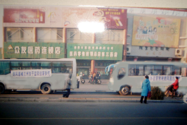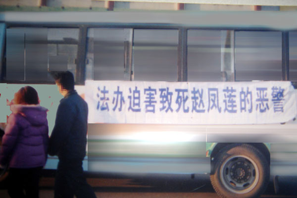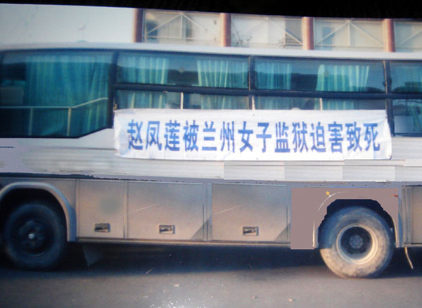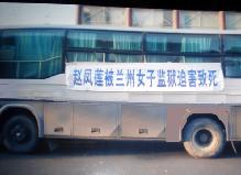 被兰州女子监狱迫害致死的赵凤莲大约在9点钟左右,送赵凤莲去殡仪馆的灵车队伍准备出发,突然在两辆车的侧面先后挂出了大横幅:“赵凤莲被兰州女子监狱迫害致死”,“法办迫害致死赵凤莲的恶警”,路上的行人纷纷驻足而视,脸上露出惊奇、疑惑的表情,有的还大声的念出横幅上的字。这时灵车队伍开始起动,令众人吃惊的是,领头的车没有按照金昌市政府规定的灵车队伍出行线路走市区副干道,而是走上了市区主干道,并每到十字路口,都神奇的碰上红灯,整个车队停在那里,引的更多的世人观看。
