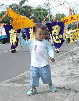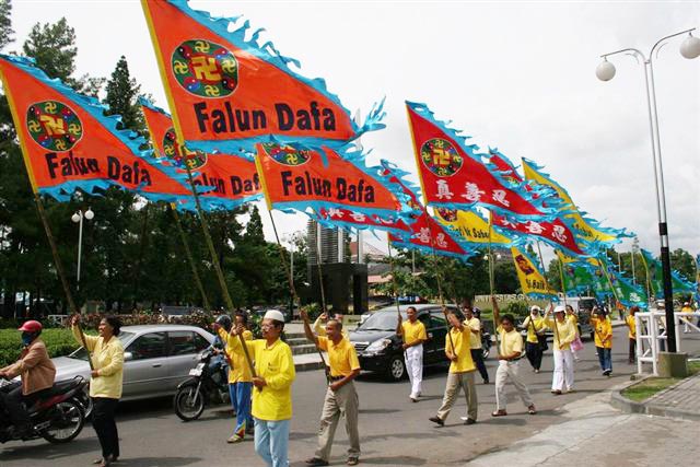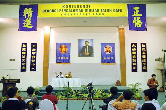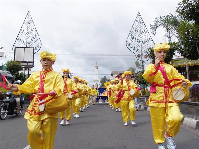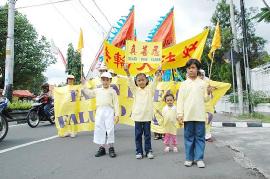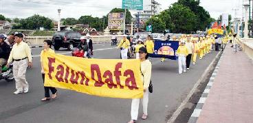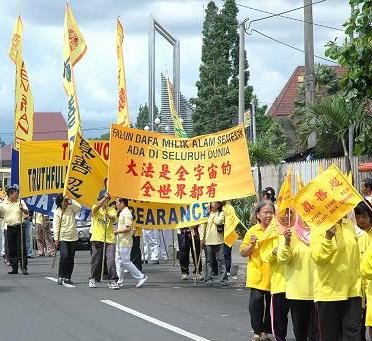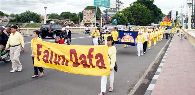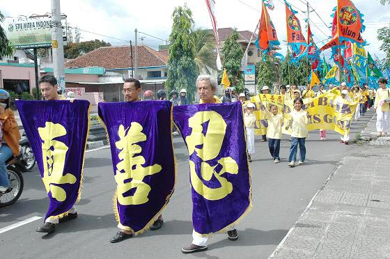 法会的前一天,印度尼西亚的学员们举办了游行等大型洪法活动,日惹市民首次看到壮观的法轮大法学员游行队伍。队伍从“卡查-玛达大学”出发并一路走下去,数十面五彩缤纷的旌旗、横幅,沿着游客聚集的玛里欧-波罗大街行走。“世界需要真、善、忍”的大字横幅成为游客和当地居民的焦点。随后,学员们集体炼功。夜晚,一盏盏烛光摆出了英文的“法轮大法”。