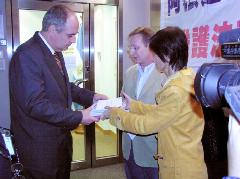 ![]() 法轮功学员游行前往阿根廷驻香港总领事馆 | ![]() 香港学员向阿根廷领馆人员递信 |