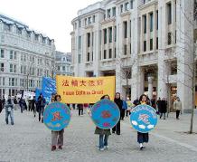 游行所到之处,人们纷纷驻足观看功法表演,认真阅读真相传单,仔细观看揭露迫害的图片,过往车辆也不时鸣笛表示支持。