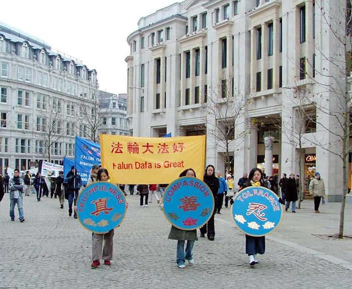 游行队伍从Monument 地铁站出发,沿Cannon Street 游行到著名的圣保罗大教堂前(St. Paul Cathedral),然后停下来炼功,发正念,向市民和游客讲中共迫害法轮功的真相,发放资料。再从圣保罗大教堂出发,穿过伦敦的金融区,到达伦敦市政厅Guildhall,在市政厅前再次停留后,游行到当地最负盛名的旅游点之一伦敦塔(the Tower of London ),穿过标志建筑伦敦塔桥(Tower Bridge),到达游行的终点—伦敦市长办公楼前(City Hall),继续炼功,发正念,讲真相,发资料。下午4点15分,整个活动圆满结束。