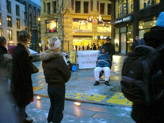 在风雪中,学员以真人模拟的方式向人们展示了法轮功学员在中国所遭受到的部份酷刑。并通过扩音器向人们揭露中共的邪恶迫害。许多行人停下脚步与学员交谈,赞扬学员坚忍不屈的精神。