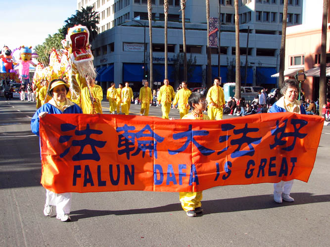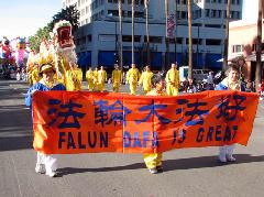 ![]() “法轮大法好”横幅 | ![]() 法轮功学员在花车上示范法轮功功法 |
