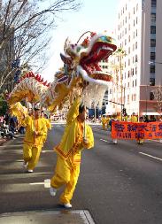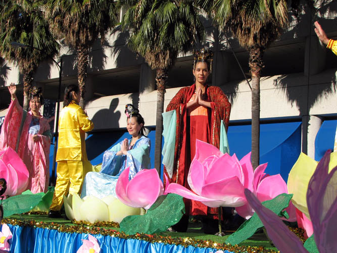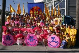 法轮功游行队伍的协调人张虹表示,今天我们的表演队伍由法轮大法横幅开道,接下来是真、善、忍牌子,百花仙子舞,花车、天女下凡舞、法轮功旗阵和舞龙。我们通过这种形式,把最美好的中国传统文化展现给世人,让更多的人了解法轮大法的美好。