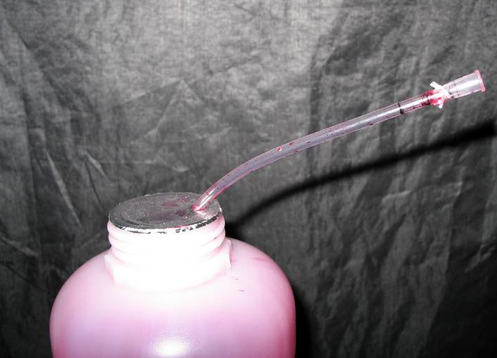 看到有很多同修灌墨水时采用直接用针头从墨水瓶中抽取墨水的方法,如果是500或1000ml的大瓶装的,经常会发生操作不慎,墨水洒的到处都是。现介绍一种方便快捷的抽墨水小窍门,需要材料有20ml注射器、医用输液管或喝饮料用的吸管。