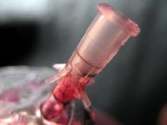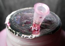 先把注射器用的针头前部的铁针部份用钳子拔出把上面的残余胶刮一下,观察针头末端塑料接嘴,如图所示,先把塑料接嘴的四个棱分别用壁纸刀割开,要注意别割断,可以作为支架防止进入墨瓶,如果不慎割断了也没关系!