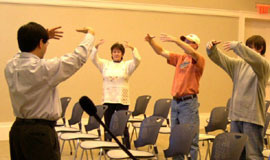 后来记者又问学员在大陆的亲人是否受到迫害,一位学员回答说她母亲因为炼法轮功被警察抓捕送進精神病院迫害了三个多月,并被强迫打针、吃药的经历。那位记者一听,问学员愿不愿意在镜头前再讲一遍,学员回答说可以。于是记者就把那位正在拍摄学功镜头的摄影师叫过来,又从新更加仔细的问了许多问题如打的什么针、吃的什么药、对身体有何伤害等等。
