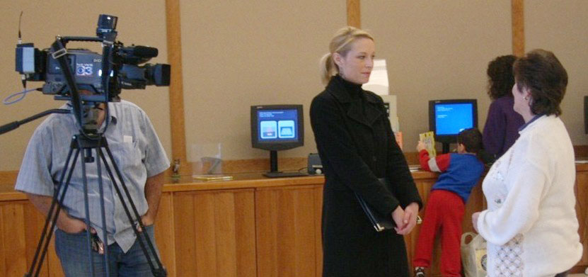 电视台的记者们在图书馆门口遇到了在发介绍法轮功传单的学员,于是他们就架起了摄像机,开始采访。记者问了很多问题,这位美国学员一一作了解答。