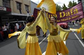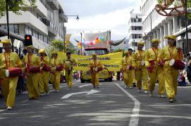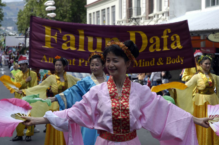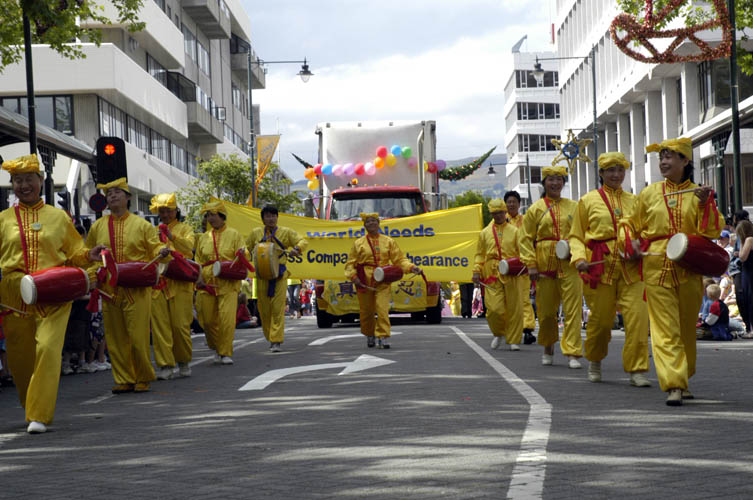 游行于周日(4日)下午3点开始,路线沿但尼丁主要街道GEORGE STREET,受到道路两旁的观众的热烈欢迎。游行队伍中以法轮功团体的腰鼓队及古装仙女舞最为引人注目;但尼丁法轮功发言人表示:“法轮功是以‘真、善、忍’为原则的修炼功法;去年参加圣诞游行时,曾受到旦尼丁游行策划单位的好评。今年是再度应邀参加。”