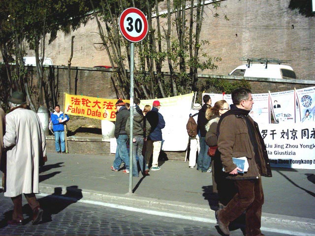 2005年1月16日那天,在罗马的法轮功学员又来到古罗马竞技场讲真象。由于受到了一些干扰,真象展的条幅和展览照片不允许象以往一样挂在石柱上。学员们便用几根木棍将展览照片和条幅悬挂起来。每个人一手扶住木棍,另一只手向行人递发传单。很多远处的行人看到学员们无法将传单递到他们手上,便主动走过来拿并对学员表示感谢。他们真诚的道谢中充满了敬意。学员们发现虽然当天的行动受到了一定的局限,但散发出去的传单一点也不比往常少,这一天也是学员们听到真诚感谢最多的一天。